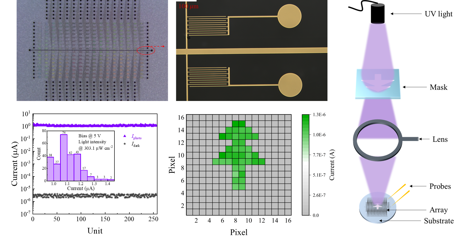 近日,得益于在Ga2O3基光电导型、肖特基型以及异质结构的光电探测器件方面的多年积累,色情网 唐为华教授领导的氧化镓创新中心(IC-GAO)成功制备出基于MOCVD生长2英寸β-Ga2O3薄膜的881616日盲紫外探测器阵列。相较于线性布局,该工作中的1616方形布局更有利于节省探测器阵列的占用面积,利于集成化应用,且无需复杂的绝缘隔离工艺可一次性、快速地对较复杂的图像进行记录并通过外部电路读出。该阵列8103的紫外/可见光抑制比显示出良好的波长选择性,为精确日盲紫外成像奠定基础。响应度达到了60.7 A W-1、探测度达到了2.21014 Jones、线性动态区为120.34 dB以及快速的响应时间。值得注意的是,对256个单元进行电学测试,发现暗电流均在2 pA4 pA间,最大标准偏差在6%-10%。这些表明了器件良好的均匀性和在紫外图像传感应用领域的潜力。相关成果发表在IEEE Electron Device Letters (doi: 10.1109/LED.2023.3272909)Science China Technological Sciences (doi: 10.1007/s11431-022-2404-8)上。论文第一作者为研究生沈高辉,通讯作者为唐为华教授和刘增副教授。工作是与郭宇锋教授团队密切合作完成,研究得到国家重点研发计划、国家自然科学基金等项目的资助。