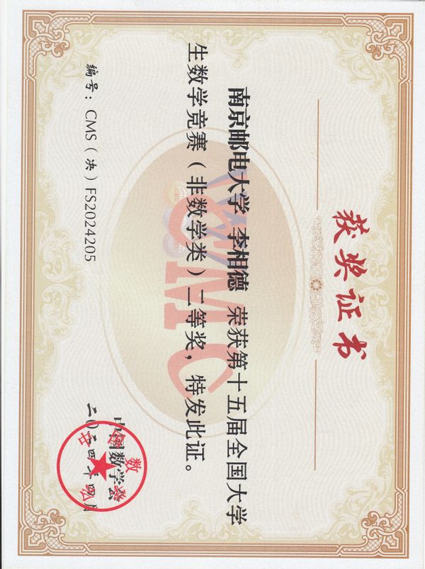 2024年4月20-21日,第十五届全国大学生数学竞赛决赛在山东大学举行。在本次竞赛中,我校取得了历史性突破的好成绩,4位非数学类参赛者全部获奖。其中,色情网 2022级微电子科学与工程专业的李相德同学荣获国家二等奖的好成绩!