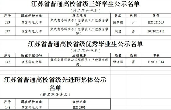 色情网 2021级B210301班荣获江苏省普通高校先进班集体,2020级汤谨溥同学荣获江苏省普通高校省级优秀毕业生,2021级博士研究生姚清同学和2021级本科生梁宇翔同学荣获江苏省普通高校省级三好学生。