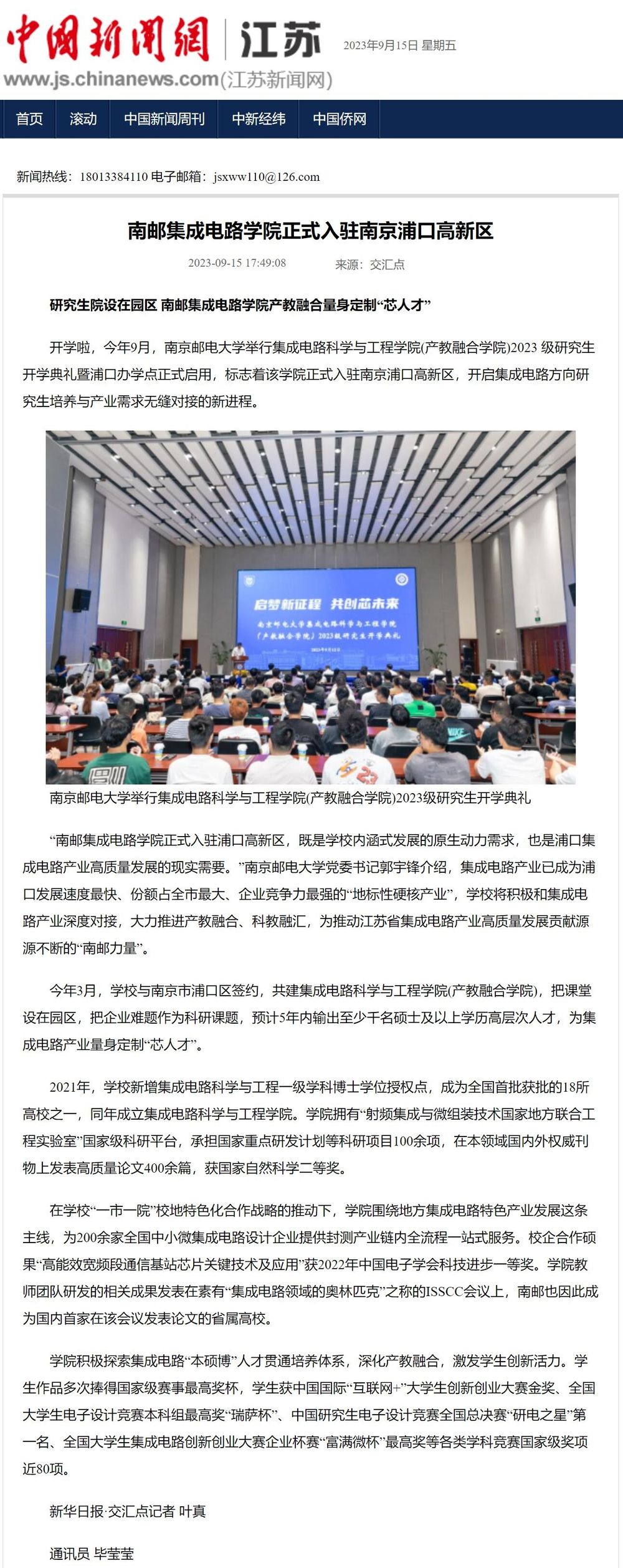 【中国新闻网】南邮集成电路色情网 正式入驻南京浦口高新区