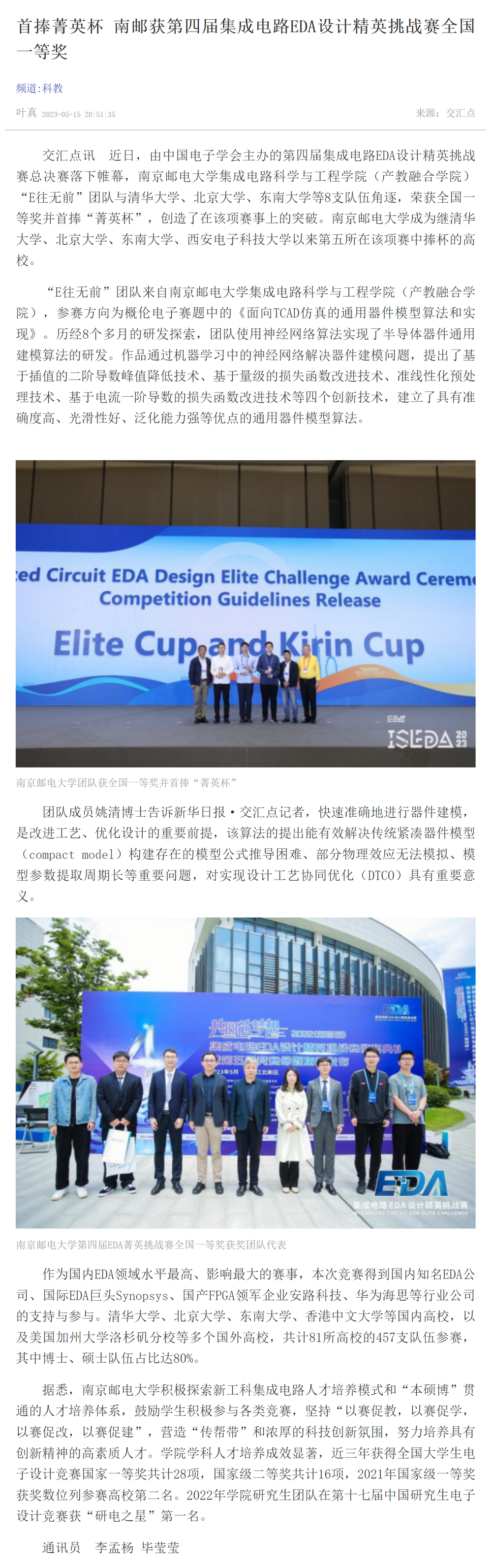 【新华日报客户端】首捧菁英杯 南邮获第四届集成电路EDA设计精英挑战赛全国一等奖