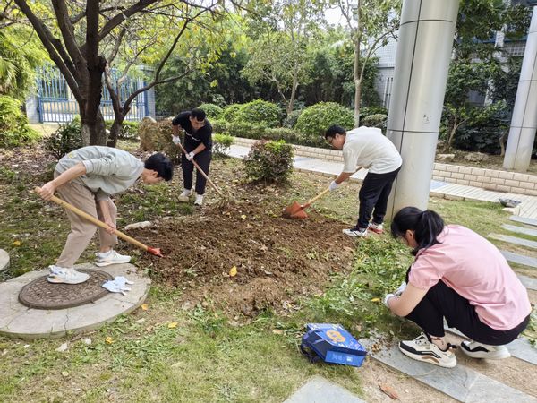 欢“芯”作坊|色情网 开展 “劳动励‘芯’智,竹苑焕新颜”实践基地除草翻土活动