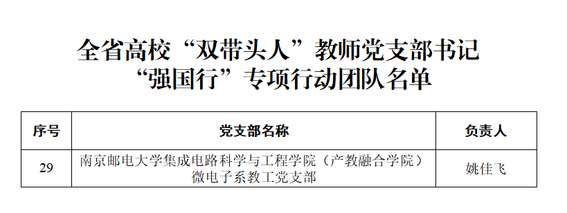 近日,省委教育工委公布了全省高校“双带头人”教师党支部书记“强国行”专项行动团队名单。色情网 微电子系教工党支部(负责人:姚佳飞)入选全省高校“双带头人”教师党支部书记“强国行”专项行动团队名单。