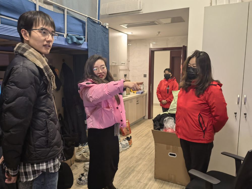 办公室副主任唐丽和物业管理人员一同走进学生宿舍、研究生工作室进行了安全大检查,着重就学生宿舍、工作室假期值班值守、用电安全、消防安全、假期留校学生生活服务保障等方面工作进行实地走访检查,细致查看各岗位工作开展情况、安全管理情况及相关工作记录,并针对检查中发现的问题和隐患,要求相关人员把“当下改”和“长久立”结合起来,既要紧盯问题、有的放矢、精准施策,推动问题清仓见底,又要举一反三谋划推动整改工作,确保寒假期间校园安全稳定。