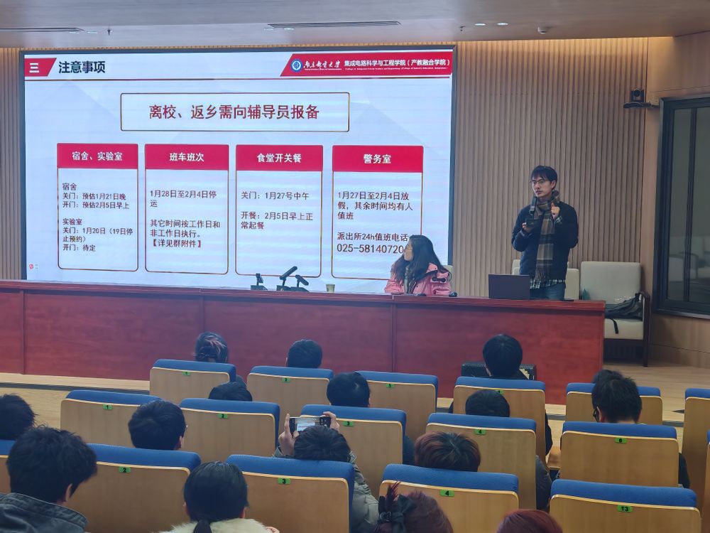 全体留校研究生参会。会上,张龙老师就寒假留校期间学生管理规范进行了解读,并为学生介绍了浦口行政、食堂、生活区等开放、关闭时间,以便同学们能够合理安排假期校内生活。肖书记在会上叮嘱同学们务必遵守假期留校的相关规定,出现任何问题应第一时间联系导师和辅导员,并结合实际案例,针对宿舍用电安全、食品安全、网络安全以及个人财物安全等提出了具体要求。