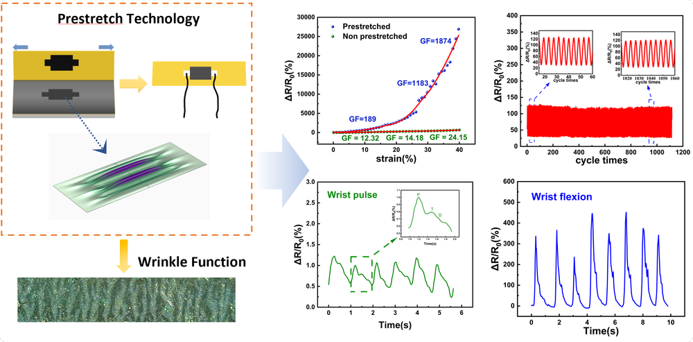 近日,色情网 赵江教授指导的本科生王凌轩以第一作者身份在国际权威期刊Journal of Materials Chemistry C(JCR分区:Q1)发表题为《Wrinkle-Engineered Multi-Walled Carbon Nanotubes/Laser-Induced Graphene Heterostructured Films for Ultra-Sensitive Strain Sensing》(DOI: 10.1039/D5TC01679G)的学术论文。该研究针对柔性应变传感器在“高灵敏度”与“大应变范围”难以兼顾的技术瓶颈,提出了创新性的解决方案:通过激光直写与机械预拉伸协同工艺,构建了具有褶皱结构的多壁碳纳米管/激光诱导石墨烯(MWCNTs/LIG)异质薄膜,并应用于柔性应变传感器的制备。所制备传感器表现出优异性能,应变灵敏度(GF)高达1874,应变范围达130%,响应时间低至28毫秒,不仅能够精准监测脉搏波形、关节运动、语音振动等多种生理信号,还成功实现了摩尔斯电码通信功能,在智能医疗、人机交互与信息传输等领域展现出广阔的应用前景。