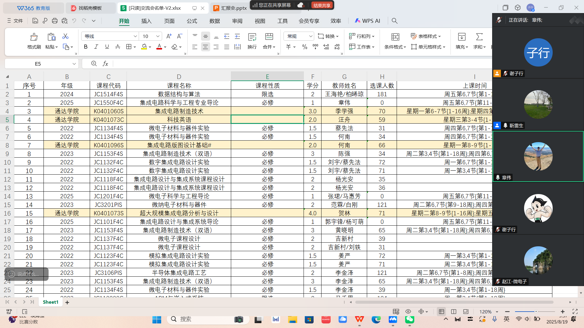 全体任课教师按照课程体系分类,依次汇报课程准备情况。从教学大纲的修订完善、教材及参考资料的遴选更新,到课程思政、教案设计、课件制作、实验项目筹备等方面,老师们详细分享了各自的准备进展。在问题交流环节,老师们分享了课程准备过程中遇到的挑战。部分教师提出,随着集成电路行业的快速发展,部分课程内容需要及时融入前沿技术成果,注重教研结合;还有教师提到实验设备老化、实验器材不足等影响实践教学开展的情况;此外,针对新入职教师在教学方法、授课计划安排等方面的困惑也进行了集中反馈。