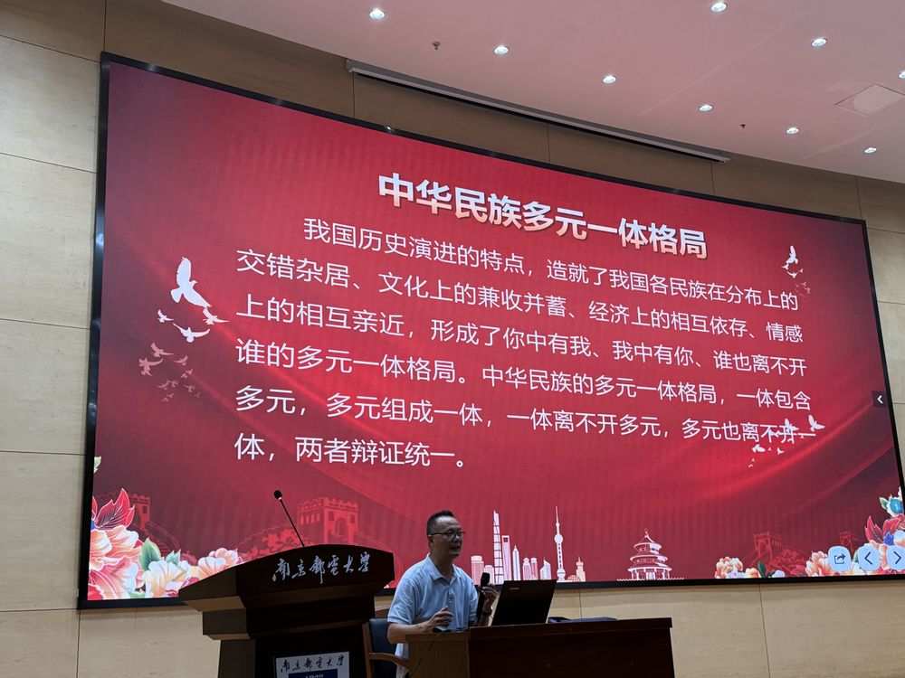 何崇军老师以宏阔的地理视角开篇,生动讲述了中国少数民族“大杂居、小聚居、交错杂居”的分布格局。他结合丰富的历史地图与人口数据,清晰勾勒出一幅中华民族多元起源、迁徙融合的壮阔画卷。他指出,中华民族的发展史就是一部各民族交往、交流、交融的历史,从历史上的“胡汉一家”到今天的“民族区域自治”,“融合”始终是贯穿其中的主线规律。何老师重点剖析了“演变-融合-发展”的历史趋势,强调在漫长的历史进程中,各民族共同开拓了辽阔疆域、共同书写了悠久历史、共同创造了灿烂文化、共同培育了伟大精神,你中有我、我中有你的民族共同体格局早已形成并不断巩固。