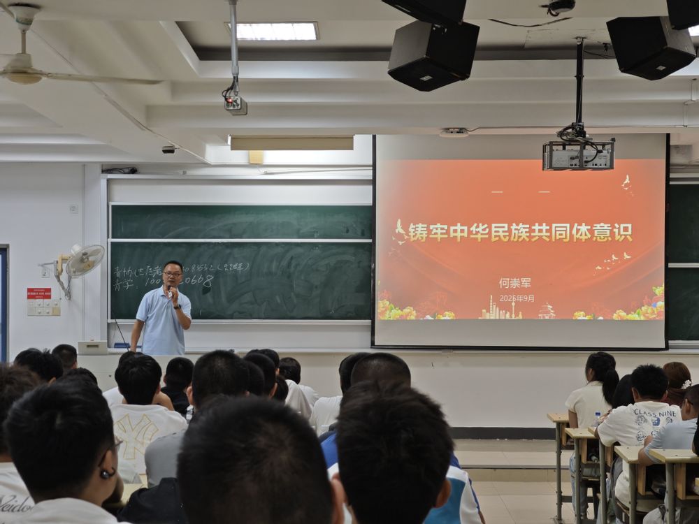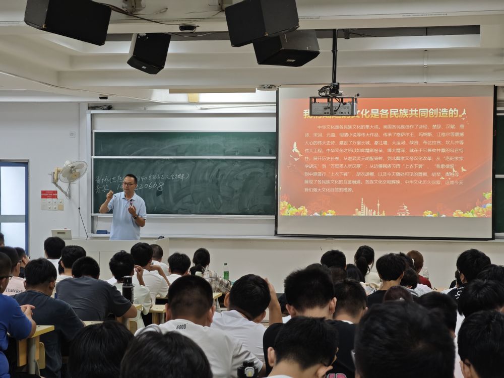 讲座最后,何崇军老师回归现实,聚焦校园生活。他向新生们阐述了铸牢中华民族共同体意识的时代要求与青年责任,强调“五十六个民族是石榴籽,中华民族是整体的石榴”的深刻比喻。他鼓励来自全国各地、不同民族的同学在日常学习、社团活动、宿舍相处中,主动交往、全面交流、深度交融,互帮互助、共同进步,将“一家亲”的理念转化为真诚的微笑、及时的帮助和深入的交流。他寄语学子,不仅要致力于攻克“芯片”领域的技术难关,更要在心中铸牢民族团结的“同心圆”,做新时代民族团结进步的坚定维护者和积极践行者。