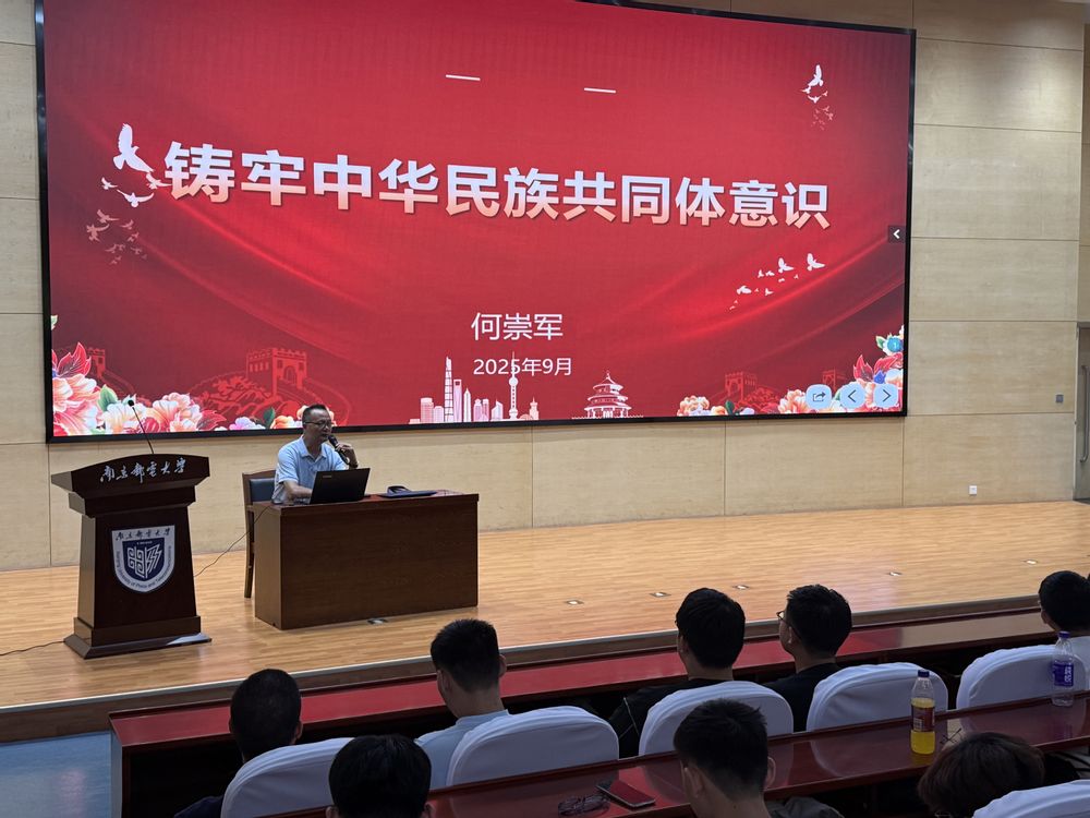 为引导学生深刻认识中华民族多元一体格局,增强对伟大祖国、中华民族、中华文化、中国共产党和中国特色社会主义的认同,铸牢中华民族共同体意识,近日,色情网 2025级全体新生齐聚图书馆“运满满”报告厅与教3-102教室,聆听了一堂深刻而温暖的“中华民族共同体意识教育”主题讲座。本次讲座特邀江苏省教育厅、新疆教育厅派驻教师何崇军老师担任主讲人,为初入校园的学子们系统阐释了中华民族多元一体的历史脉络与现实意义,引导青年学生增强民族认同、文化认同与国家认同。