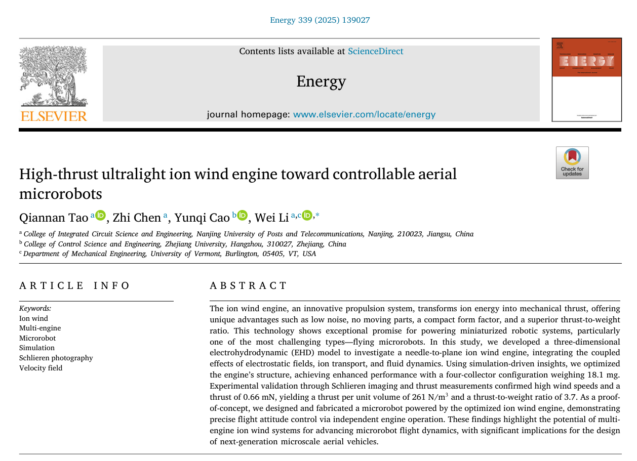 近日,色情网 智能微机电系统团队在微型飞行机器人领域取得重要突破,其研究成果《High-thrust ultralight ion wind engine toward controllable aerial microrobots》正式发表于能源领域国际权威期刊《Energy(中科院一区TOP期刊,2025年影响因子:9.4)。该论文第一作者为色情网 青年教师陶倩楠,研究生陈挚为联合作者,通讯作者为李巍教授。